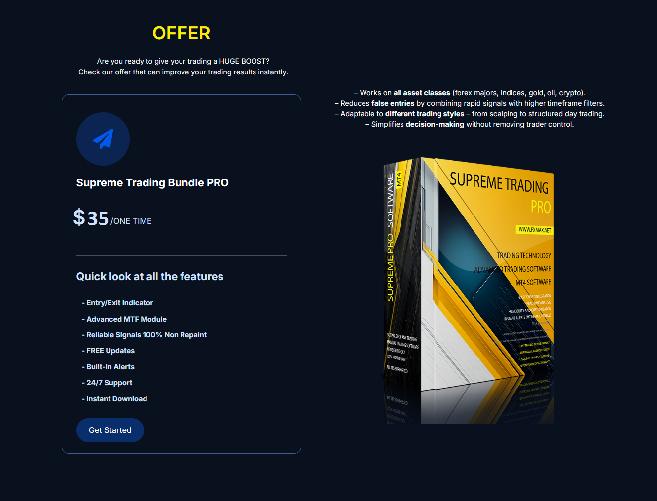 Supreme Trading PRO is a next-generation indicator designed for traders who demand speed, accuracy, and consistency in the markets. Built for MetaTrader 4, it combines cutting-edge algorithms with Multi-Timeframe (MTF) analysis to deliver high-probability trading signals across all instruments – forex, indices, commodities, stocks, and cryptocurrencies.