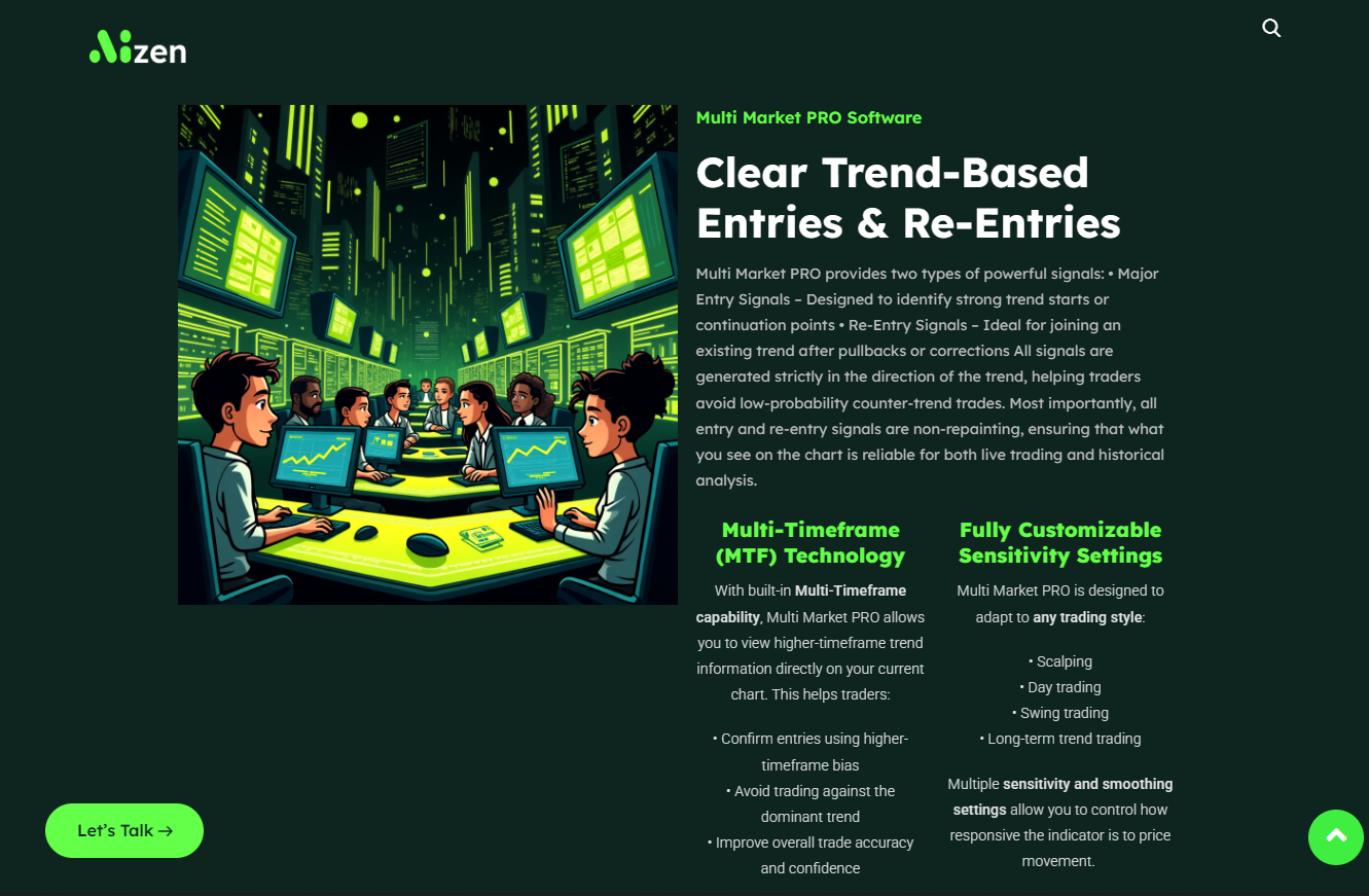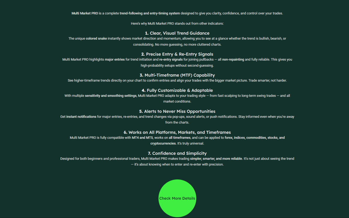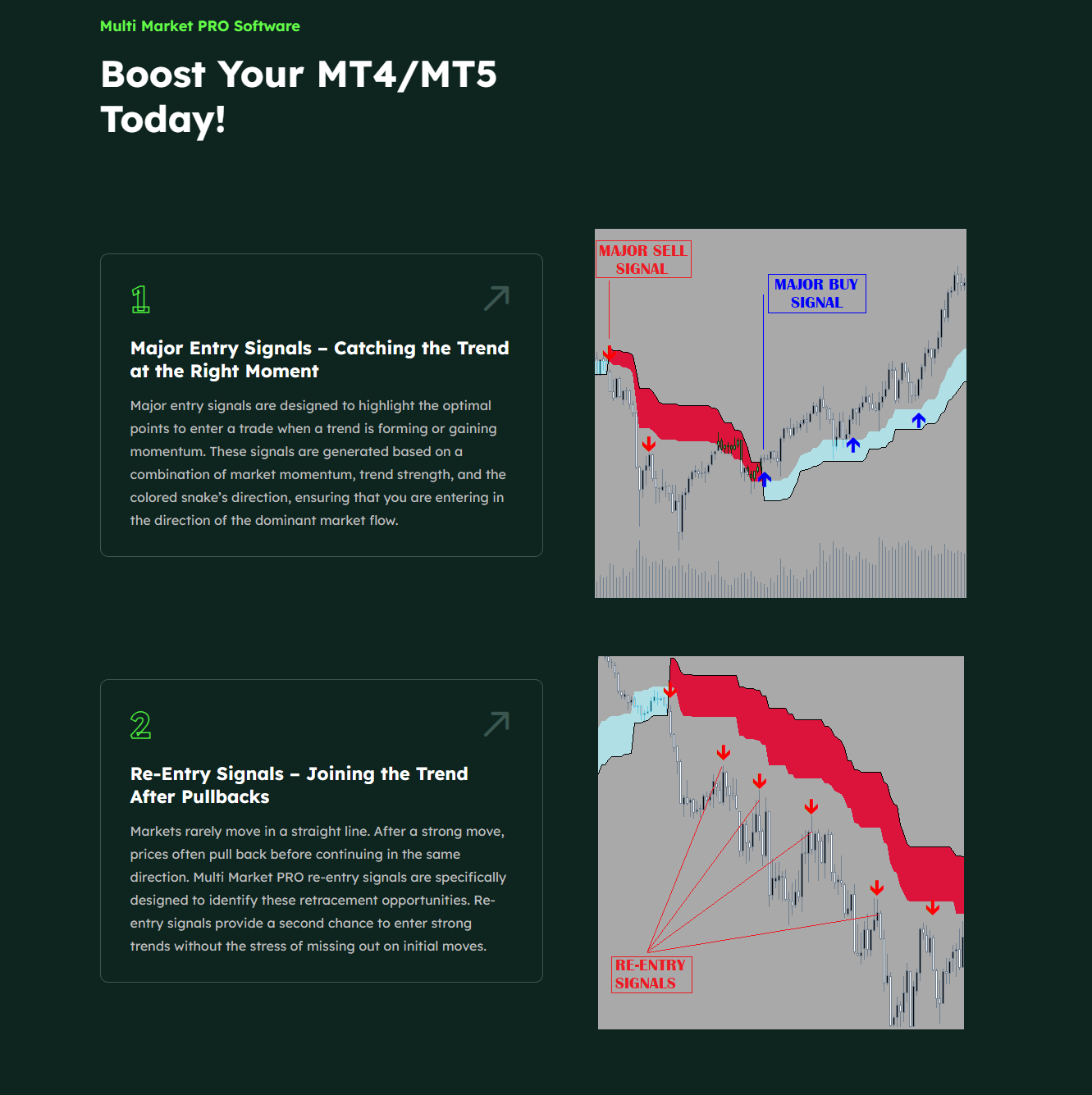 Markets often move in waves. Multi Market PRO recognizes pullbacks within a trend and provides re-entry signals, allowing traders to scale in or re-join an existing trend without chasing price. This feature is ideal for trend riders and position traders looking to maximize returns during sustained moves.
