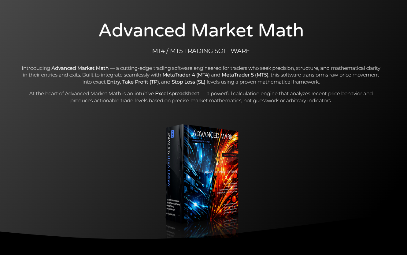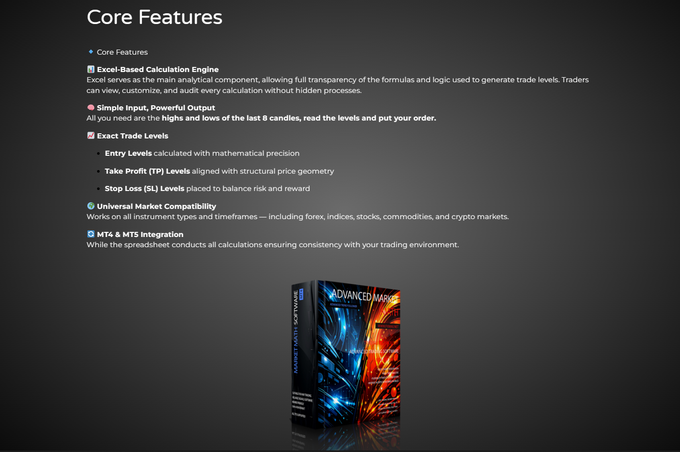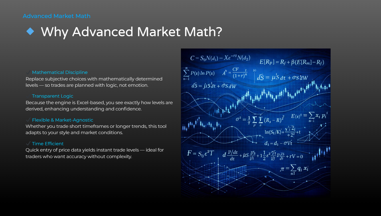 Advanced Market Math is a next-generation trading software built for traders who rely on logic, structure, and mathematical precision rather than indicators, guesswork, or emotion. Designed around Market Math Theory, this software delivers a powerful Excel-based spreadsheet that calculates high-probability entry points, take profit targets, and stop loss levels with clarity and consistency.