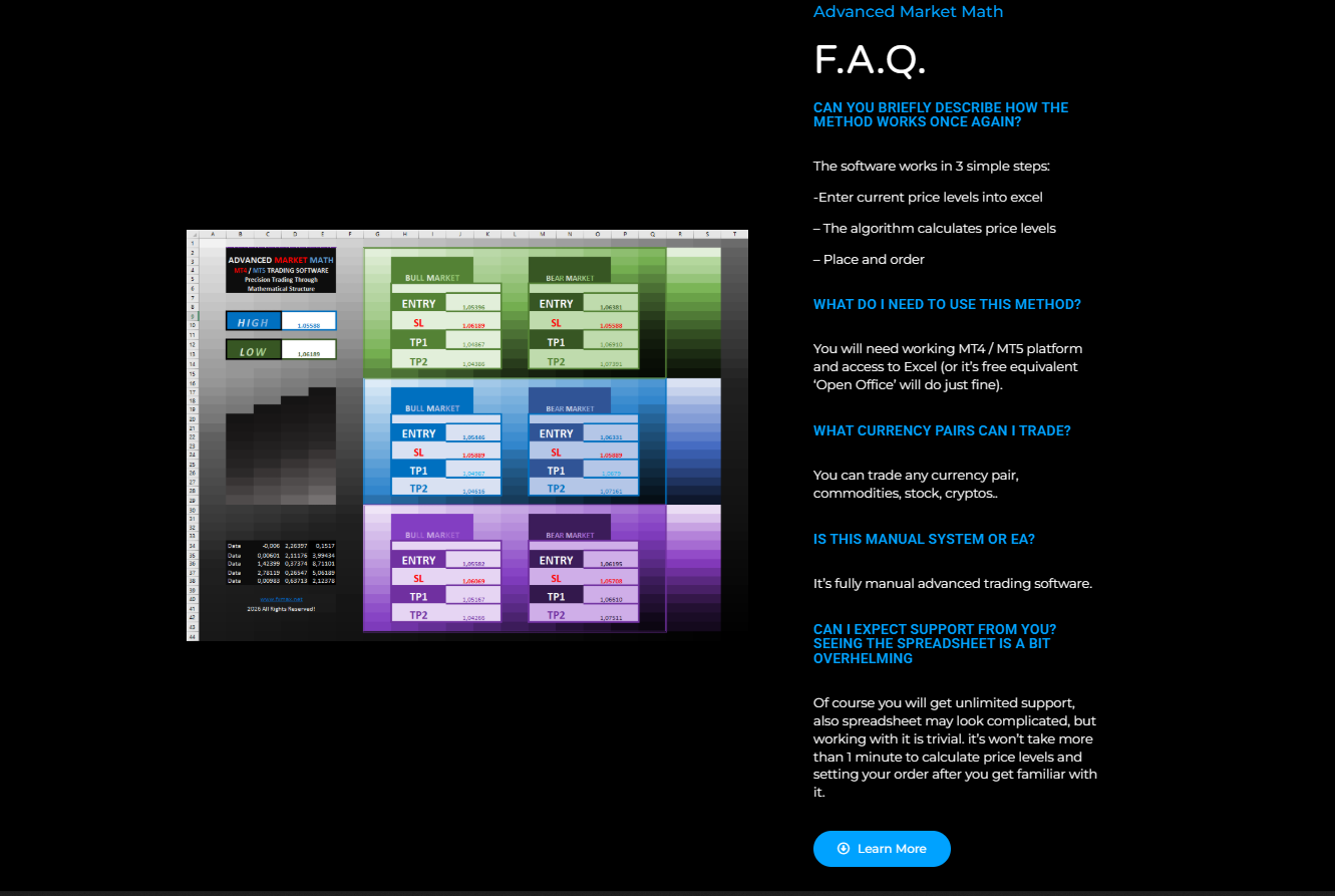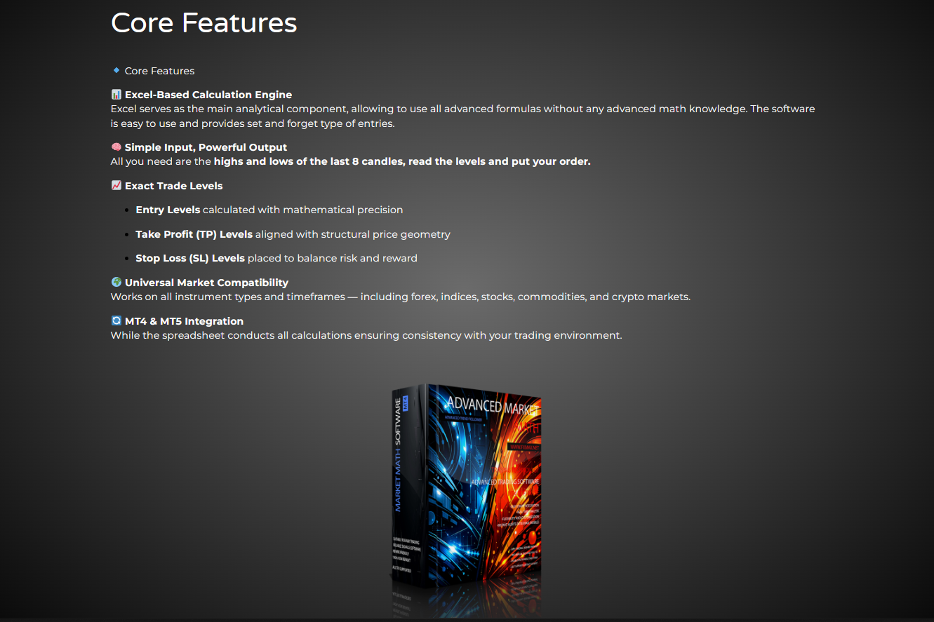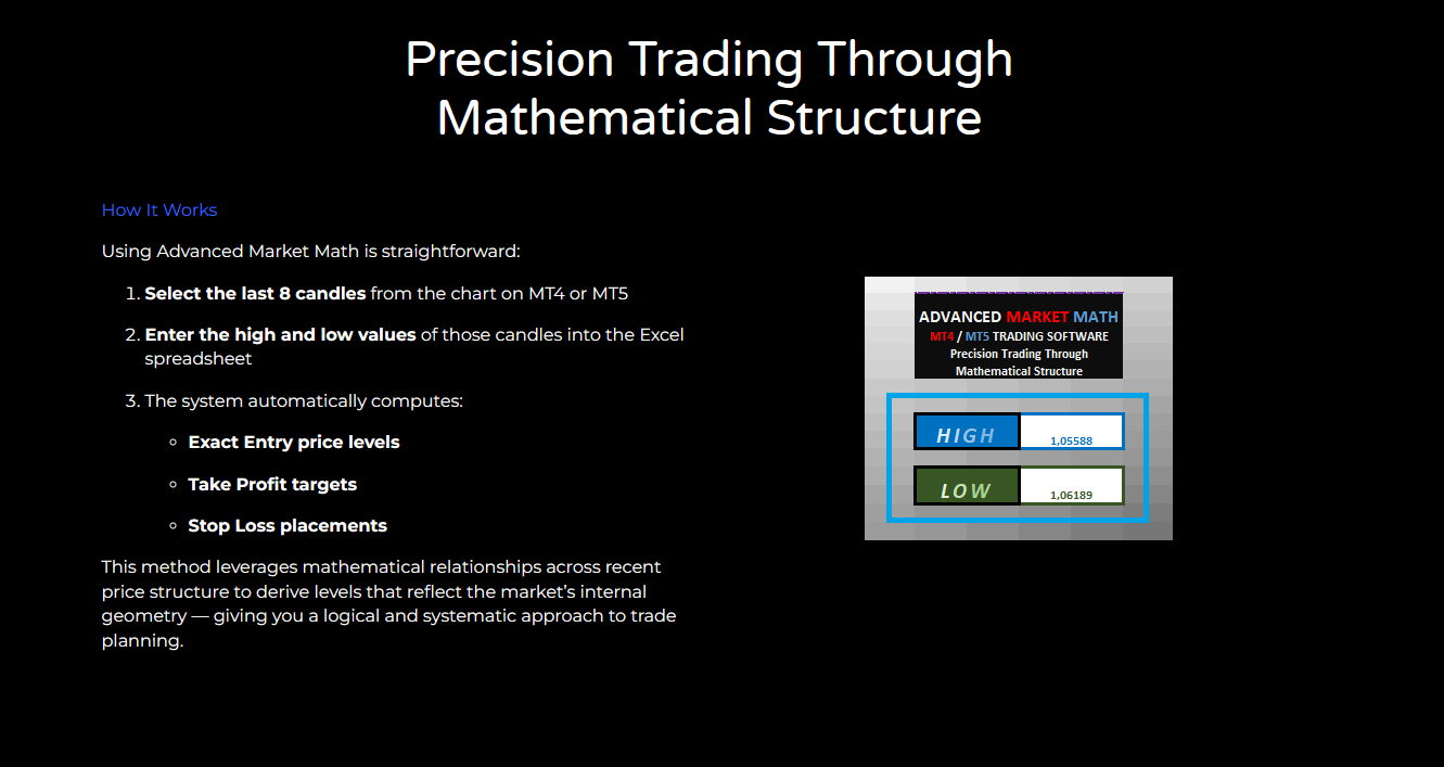 Advanced Market Math is a next-generation trading software built for traders who rely on logic, structure, and mathematical precision rather than indicators, guesswork, or emotion. Designed around Market Math Theory, this software delivers a powerful Excel-based spreadsheet that calculates high-probability entry points, take profit targets, and stop loss levels with clarity and consistency.