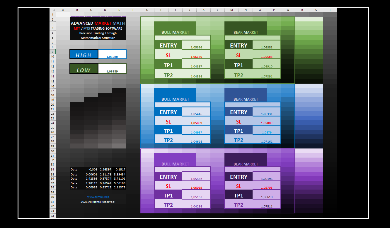 At the core of the software is an advanced Excel spreadsheet that transforms raw price data into actionable trading levels. By applying mathematical relationships inherent in market movement, the tool identifies structurally valid price zones where trades can be planned with defined risk and reward.
