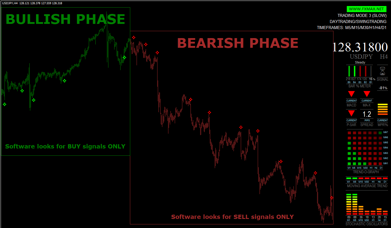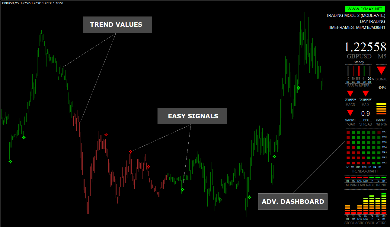 – An indication of the market trend using Moving Averages on timeframes M1 to D1.