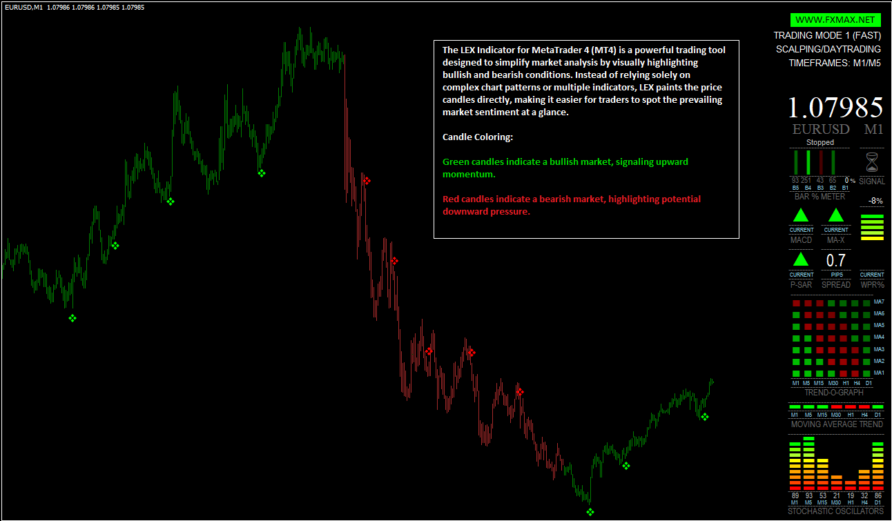 The LEX Indicator is a custom tool for MetaTrader 4 (MT4) that helps traders identify market direction and potential entry points more clearly. It does this by painting candles on the chart in different colors, depending on whether the market is showing bullish or bearish momentum.