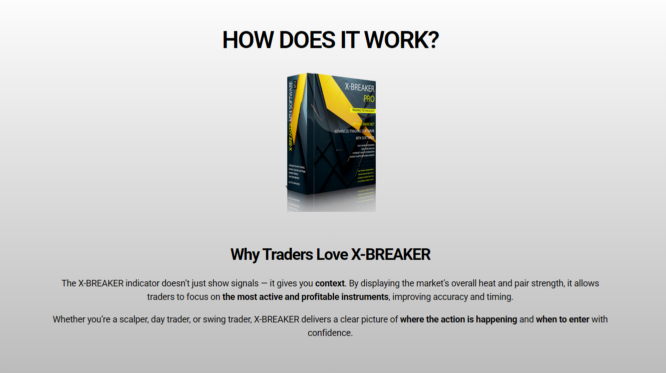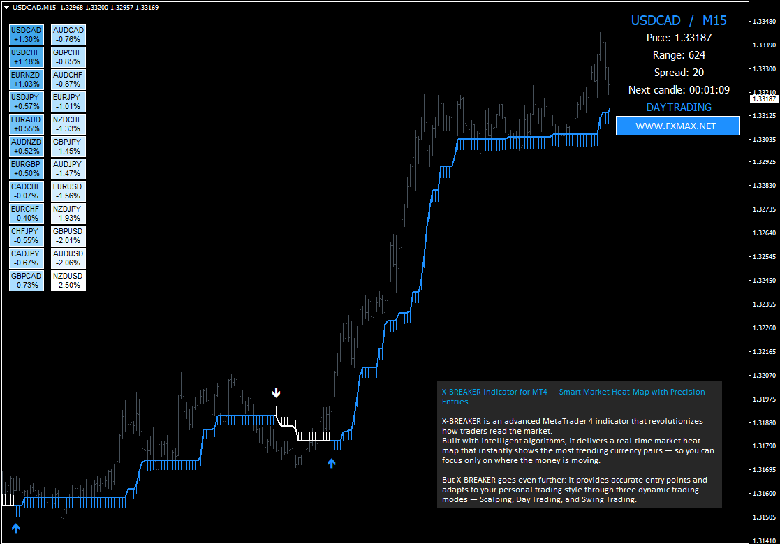 The X-BREAKER Indicator is an advanced analytical tool for MetaTrader 4 designed to identify high-probability trading opportunities through a market heat-map system and trend-based entry detection.