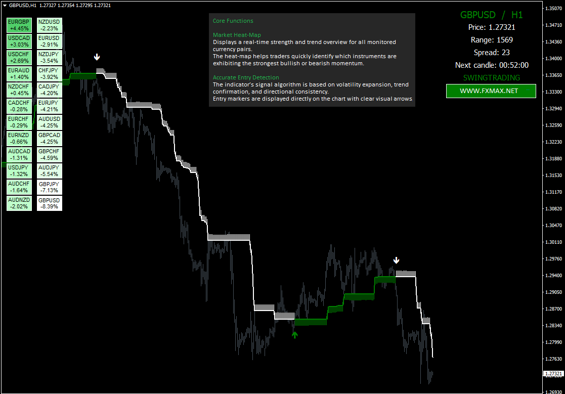 The heat-map helps traders quickly identify which instruments are exhibiting the strongest bullish or bearish momentum. -