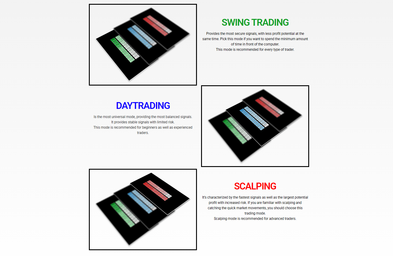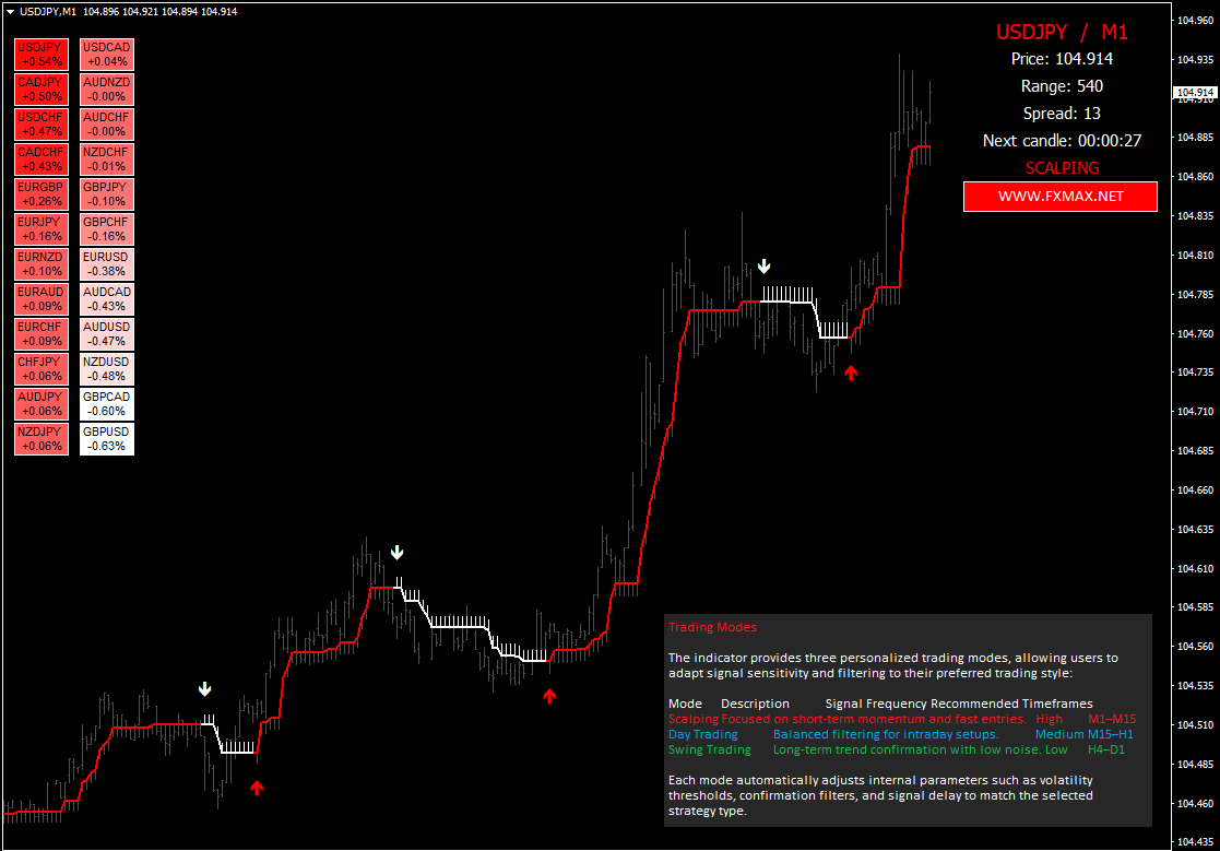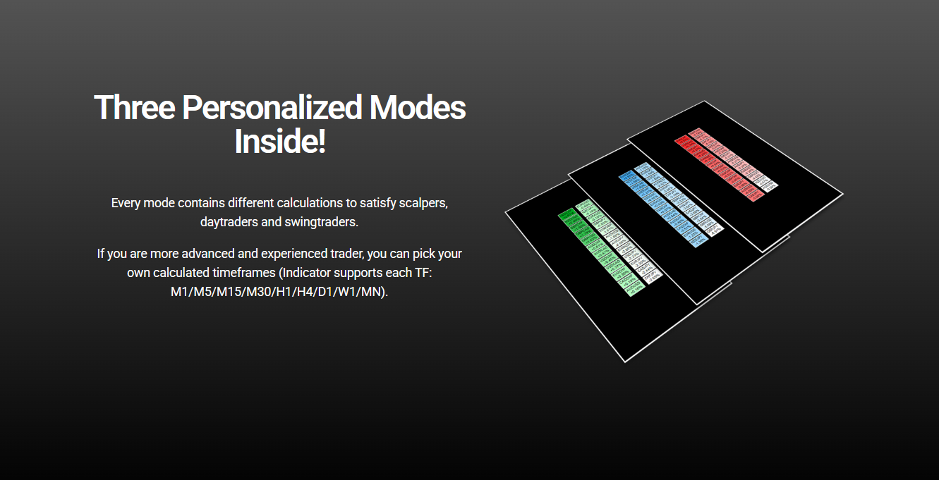 The indicator provides three personalized trading modes, allowing users to adapt signal sensitivity and filtering to their preferred trading style: