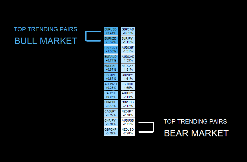Displays a real-time strength and trend overview for all monitored currency pairs.
